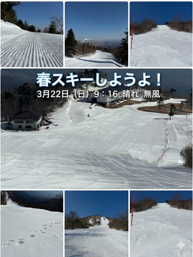日々のゲレンデコンディション状況をお知らせいたします。画像は石子ゲレンデ、ダイナミックコース等、3/22現在、4.3キロのロングコースまだ滑走可能です。皆様のご来場をおまちしております。